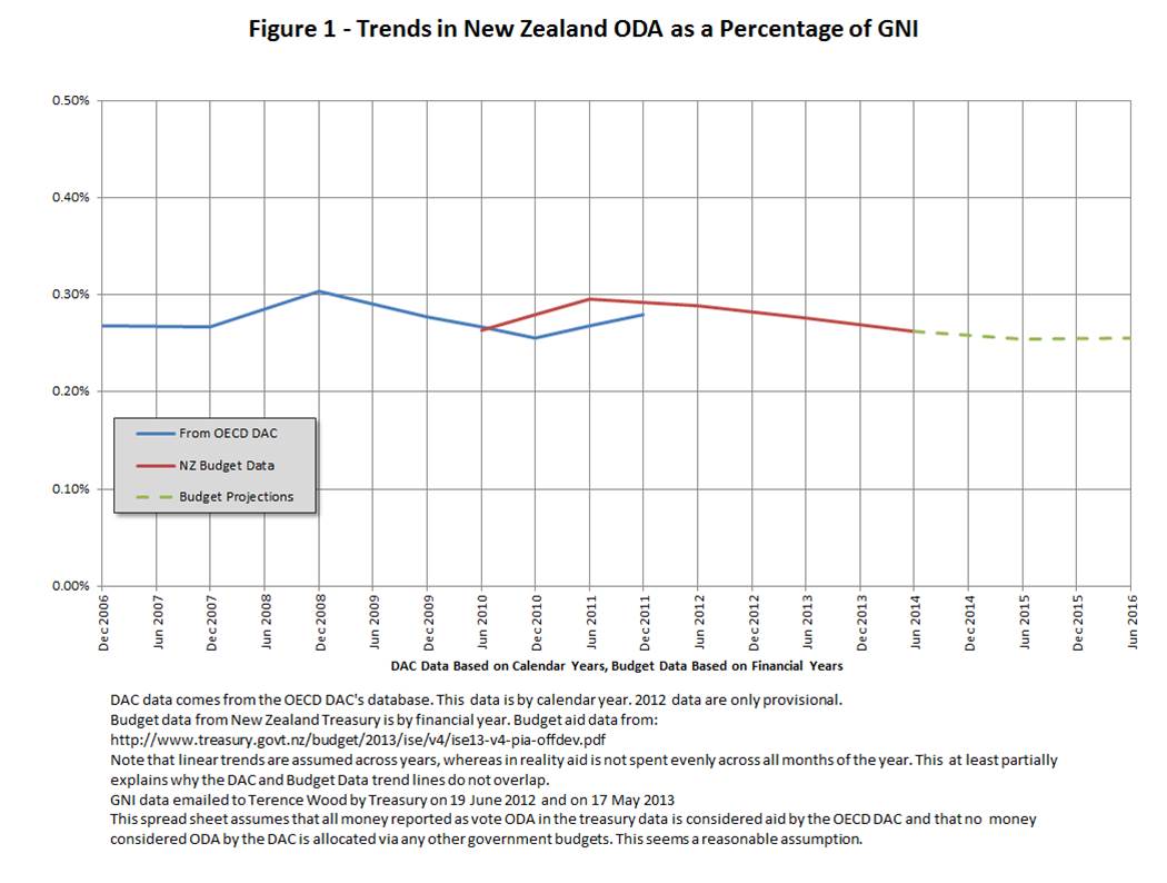 Of course, the Australian economy is much larger than New Zealand’s but even when taking this into account, the increases in Australian aid stand in stark contrast to a New Zealand aid budget that is barely growing. New Zealand’s budgeted ODA spend for the 2013/14 financial year is $567 million NZD. That is an increase on the estimated spend of $558 million NZD for this financial year, but as an increase it is less than expected inflation (so actually a small aid cut in real terms), and less than anticipated GNI growth, meaning New Zealand’s aid to GNI ratio will fall. Figure 1 below illustrates this. (Note that future GNI figures are our estimates based on numbers from the last budget adjusted for changed GDP growth; we are awaiting official GNI data from Treasury and will update this post when we have it. We do not anticipate major adjustments.) [Update: we now have official GNI projections from Treasury (thank you!). These are reflected in the updated figure 1 below. Note that the only change is that Aid/GNI in 2014/15 is 0.25% not 0.26%).]