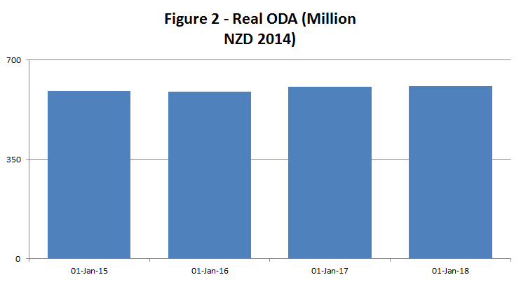 As it is budgeted, New Zealand’s aid spend for the coming financial year is effectively identical to this year’s. Although starting July 2015 (which is the first year of a new three year spending tranche) aid is – as Figure 1 below shows – forecast to rise in nominal terms.